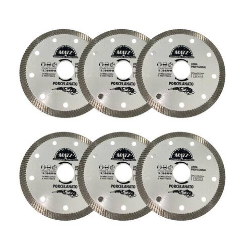 Kit 6 Disco Corte Turbo Para Porcelanato 110Mm X 22,23Mm Matz Disco de corte turbo diamantado para porcelanato, ideal para cortes precisos a seco e refrigerado. Compatível com esmerilhadeira, possui furo adaptável e acompanha anel de redução para uso em serra mármore Makita . Seu design turbo garante cortes rápidos e sem lascas, oferecendo alta durabilidade e acabamento impecável. Perfeito para aplicações em porcelanato, combinando praticidade e desempenho profissional em diferentes ferramentas.