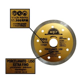 Informações técnicas: Perfil do corte: Liso Diamantado Tipo de corte: A seco Dimensões: - Diâmetro externo: 110mm 4.3/8'' - Diâmetro do furo: 20mm - Perfil de corte: 8mm - Espessura: 1,2mm Rotação máxima por minuto RPM : 13.300 - 80m/s Para corte de: Porcelanato, mármore e marmoglass Proporciona qualidade e produtividade na operação Produto de altíssima qualidade com alta performance
