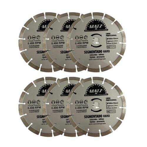 Informações técnicas: Perfil do corte: Segmentado Diamantado Tipo de corte: A seco e refrigerado Dimensões: - Diâmetro externo: 180mm 7.1/4'' - Diâmetro do furo: 22,23mm 7/8'' - Acompanha anel de redução para 20mm - Perfil de corte: 10mm - Espessura: 2mm Rotação máxima por minuto RPM : 8.400 - 80m/s Para corte de: Concreto, telha, tijolo e alvenaria Proporciona qualidade e produtividade na operação Produto de altíssima qualidade com alta performance