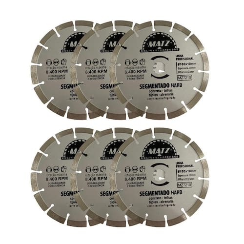 Informações técnicas: Perfil do corte: Segmentado Diamantado Tipo de corte: A seco e refrigerado Dimensões: - Diâmetro externo: 180mm 7.1/4'' - Diâmetro do furo: 22,23mm 7/8'' - Acompanha anel de redução para 20mm - Perfil de corte: 10mm - Espessura: 2mm Rotação máxima por minuto RPM : 8.400 - 80m/s Para corte de: Concreto, telha, tijolo e alvenaria Proporciona qualidade e produtividade na operação Produto de altíssima qualidade com alta performance