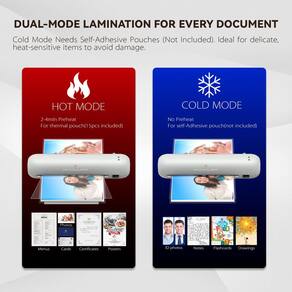 - Modos duplos para resultados perfeitos: se você está trabalhando com documentos padrão ou materiais delicados e sensíveis ao calor, este laminador tem o que você precisa. Use o modo quente para papéis, fotos e certificados comuns (compatível com as bolsas de laminação térmica incluídas no kit). Para o modo frio, emparelhe-o com folhas de laminação autoadesivas (não incluídas) para proteger adesivos, fotografias antigas ou itens frágeis sem qualquer calor.