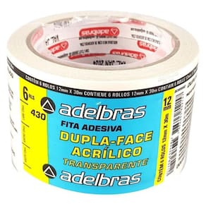 Kit 6 Fita Dupla Face Transparente 12 Mm X 30 M AdelbrasUma ótima opção para quem quer comprar 6 fita dupla face transparente 12 mm X 30 m adelbras para fixação de cartazes, enfeites, arranjos, montagens em geral, decorações, outros etc. Filme polipropileno bi-orientado coberto com adesivo á base de água de ambos os lados.Liner de papel siliconado (antiaderente)Embalagem contém: 6 rolosMedidas: 12 mm x 30 metrosMarca: Adelbras.Composição: Liner de proteção siliconado filmede polipropileno e adesivo acrílico à base de aguá.Medidas: 18 mm x 50 m.Peso: 280 Gramas.Validade: Janeiro 2025.