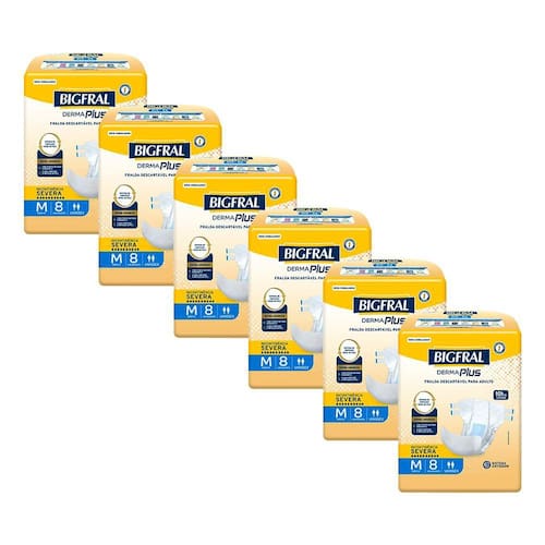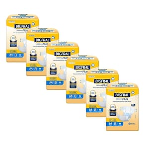 O Kit contém: 6 pacotes de Fraldas Geriátricas Bigfral Derma Plus M com 8un cada.