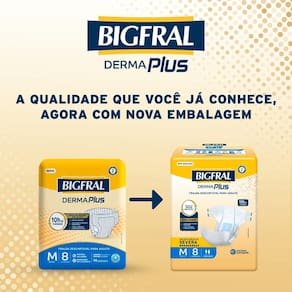 A Bigfral DermaPlus foi desenvolvida para adultos com incontinência urinária severa. Possui o exclusivo sistema de proteção total da pele, com extratos naturais hidratantes que ajudam a prevenir irritações, mantendo a pele protegida e saudável, além de sistema antiodor, trazendo até 10h de proteção e cuidado.