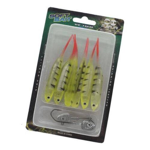 Kit com 6 iscas soft de silicone + 2 anzois zig head.Isca construída em silicone, possui formato anatomico.A isca soft bait é indicada para pesca de robalos, badejos, garoupas, tucunarés, black bass, traíra entre outros predadores.Também pode ser usada com jig heads de vários pesos.Especificações:Marca: MaruriModelo: W189Comprimento isca: 10cmPeso isca: 6 gramasAnzol: 1 anzol jig 15gr / 1 anzol jig 18gr