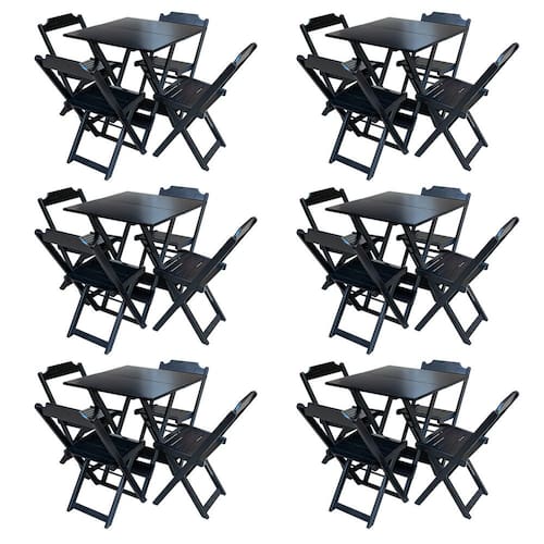 Kit 6 Jogos de Mesa com 4 Cadeiras de Madeira Dobravel 60x60 Ideal para Bar e Restaurante - Preto - Preto