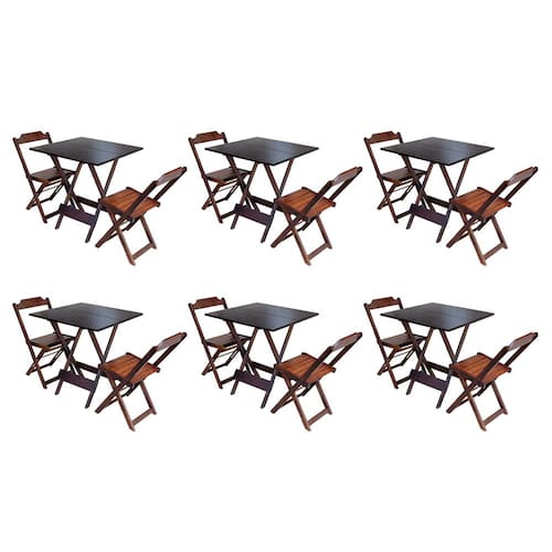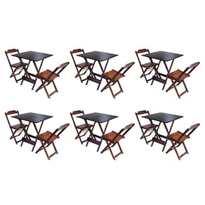 Kit 6 Jogos De Mesa Dobravel Com 2 Cadeiras De Madeira 70x70 Ideal Para Bar E Restaurante - Imbuia é ideal para bares, restaurantes, estabelecimentos, áreas de lazer e também para sua casa. Seu design permite que seja encaixado em qualquer ambiente, trazendo um toque a mais para seu estabelecimento. Além de sua durabilidade, o que lhe trará conforto para servir seus clientes. Por ser dobrável torna-se mais fácil guardar, manusear e limpar o produto. Atenção: EVITE USAR PRODUTOS ABRASIVOS E QUíMICOS PARA LIMPEZA DO PRODUTO, aconselha-se o uso de pano umedecido para melhor conservação; mantenha o produto fora de chuva e sol constantes. Dimensões: Medidas da Mesa: Altura: 76cm Largura: 70cm Comprimento: 70cm