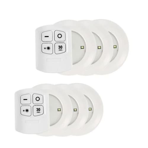 Kit 6 Luminaria Lampada Led Spot Sem Fio Controle Remoto Pilha Adesivo Iluminação de Ambientes O controle remoto IR permite que você ajuste o brilho em 2 níveis, e também, permite o controle de tempo para desligar a luz em 30 minutos sem fio. Você também pode ligar / desligar a luz do disco, tocando no na lente das luzes. Cada luminária possui 5 leds. Instalação Fácil: Use o adesivo de dupla face para fixar em qualquer lugar que você queira iluminar. Alimentado por pilhas AAA não incluídas para instalação sem fio. Ideal para cozinha, armário, Rack, mesinha de cabeceira, balcão, prateleira, garagem, porão , Como luz de emergência ou locais escuros semelhantes, onde você pode precisar de alguma iluminação forte por alguns minutos de vez em quando. 5 leds em cada luminária Cor da Luz: Branco Frio Potência: 5w por Luminária Tipo de bateria: 3 pilhas AAA Tipo de bateria de controle remoto: 2 pilhas AAA Tipos de acendimento: toque ou controle remoto Dimensão lâmpada: 9x7x2.1cm Dimensão controle: 8x5.9x1.5cm Conteúdo da embalagem 6 Luminárias Com 5 Leds Cada 2 Controles Remotos Imagens meramente ilustrativas Marca: Não Informado
