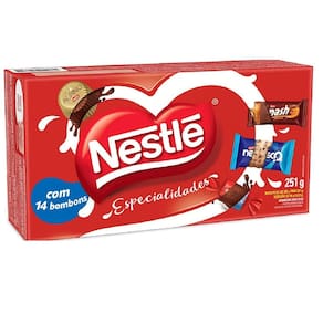 Kit 6 nestle bombons 251gr espec. Cx Os bombons nestlé especialidades são uma caixa de bombons que contém os maiores sucessos da nestlé. A caixa inclui bombons de chocolate branco, chocolate ao leite, recheados com amendoim e morango, entre outros. A caixa de bombons nestlé especialidades contém: -derivados de leite, soja, ovo, cevada e trigo -lactose -glúten -aromatizante sintético A caixa de bombons nestlé especialidades contém: -prestígio, alpino, suflair, classic ao leite, galak, lollo, charge, sensação, chokito, smash, negresco. Contém:251g Cod. Ean 7891000325131 Formato de venda: 01 kit Contém:6 unidade nestle bombons 251gr especialidades Marca: Não Informado