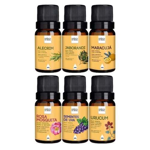 Kit 6 Óleos Vegetais Revitalização Total Profunda - Natural kit 6 Óleos Vegetais Revitalização Total Profunda - Natural Essência do Brasil Os óleos vegetais carregam a alma e a essência da natureza em cada gota. Eles têm sido usados há séculos para nutrir, revitalizar e restaurar o equilíbrio da pele e do cabelo. Descubra o Poder de Cada Óleo Óleo de Alecrim Óleo natural, rejuvenesce os folículos capilares e melhora a circulação, promovendo um cabelo mais saudável. Óleo de Jaborandi Amplamente reconhecido por fortalecer os cabelos, combate a queda e incentiva um crescimento vigoroso. Óleo de Maracujá Suaviza e acalma a pele, proporcionando uma sensação relaxante e aliviando a pele estressada. Óleo de Rosa Mosqueta Rico em ácidos graxos essenciais, é perfeito para regenerar a pele e atenuar marcas e cicatrizes. Óleo de Semente de Uva Com propriedades antioxidantes, mantém a pele jovem, protegendo-a dos danos dos radicais livres. Óleo de Urucum Um potente aliado para obter um bronzeado natural, também protege e nutre a pele. Benefícios - Ajuda o crescimento saudável dos cabelos.- Regenera e rejuvenesce a pele.- Combate os danos dos radicais livres.- Suaviza e acalma irritações.- Fortalece e revitaliza os folículos capilares.- Proporciona um bronzeado luminoso e protegido. Cuidados e Precauções A natureza nos presenteia com estes óleos incríveis, mas lembre-se: faça sempre um teste de patch antes de usar. Mantenha fora do alcance das crianças e evite a ingestão. Diferencial da Essência do Brasil Cada óleo é embalado ao ritmo harmonioso de música clássica, promovendo uma experiência de unboxing verdadeiramente única. Apresentação A fim de manter a integridade dos nossos óleos, utilizamos frascos de vidro âmbar, acompanhados de tampas com lacre preta ou branca , preservando sua frescura e potência. Dicas de Uso - Misture algumas gotas ao seu creme noturno para potencializar os benefícios de hidratação e regeneração.- Para uma massagem relaxante, aplique diretamente na pele ou misture com seu óleo de massagem preferido. Por que Escolher a Essência do Brasil Nossa paixão é trazer a autêntica riqueza da natureza brasileira diretamente para você. Com a Essência do Brasil, você experimenta a natureza em sua forma mais pura. Seu corpo merece o melhor. Escolha Essência do Brasil e sinta a diferença. Renove-se com a força da natureza. Marca: Essência Do Brasil