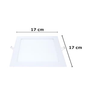 Informações técnicas: LED integrado Potência: 12W Temperatura: 4000K Emissão de luz neutra Medida: 17x17 cm Forma: Quadrado Lúmens: 720 IRC: =70 Ângulo de abertura: 120 Material: Corpo em alumínio, difusor em vidro, corpo do driver em plástico Eficiência luminosa: 60lm/W Painel de embutir Vida útil: 25 mil horas L70 Pode ser ligado diretamente na rede elétrica em 127V ou 220V Espessura do forro deve ser pelo menos 1cm Não permite dimerização