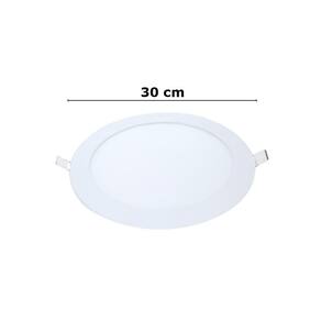 Informações técnicas: LED integrado Potência: 24W Temperatura: 3000K Emissão de luz amarela Diâmetro: 30 cm Forma: Redondo Lúmens: 1680 IRC: =70 Ângulo de abertura: 120 Material: Corpo em alumínio, difusor em vidro, corpo do driver em plástico Eficiência luminosa: 70lm/W Painel de embutir Vida útil: 25 mil horas L70 Pode ser ligado diretamente na rede elétrica em 127V ou 220V Espessura do forro deve ser pelo menos 1cm Não permite dimerização