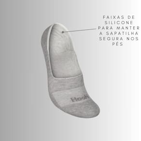 Possui calcanhar verdadeiro e faixas de silicone no calcanhar que possibilitam que a meia sapatilha fique segura nos pés.