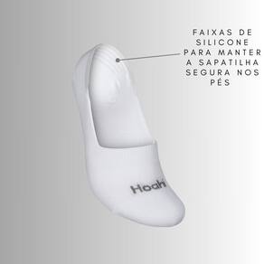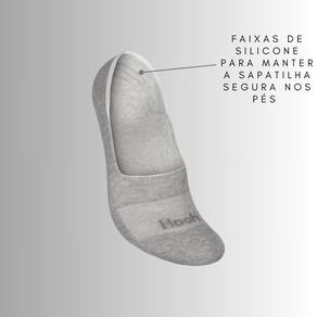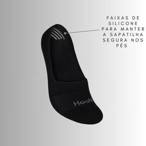Possui calcanhar verdadeiro e faixas de silicone no calcanhar que possibilitam que a meia sapatilha fique segura nos pés.