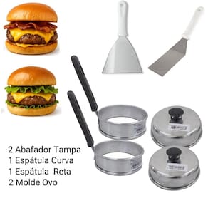 Kit 6 Peças Lanchonete Hamburgueria Chapa Lanche Hambúrguer Artesanal Espátulas Modelador Prepare Lanches e Hambúrgueres Perfeitos em Casa com Praticidade Eleve o nível dos seus lanches caseiros com este kit essencial Ideal para quem ama hambúrgueres suculentos, ovos no ponto certo e a praticidade de ter as ferramentas certas sempre à mão. Surpreenda sua família e amigos com preparos dignos de lanchonete, feitos no conforto da sua cozinha. O que você recebe neste Kit Completo: 2 Abafador de Hambúrguer em Alumínio 2 Molde para Fritar Ovos em Alumínio 1 Espátula Reta em Aço Inox 1 Espátula Curva em Aço Inox - Não enferruja; - Alta durabilidade; - Fácil de limpar; - Não amassa; - Mais praticidade Espátulas de Aço Inox projetadas perfeitamente para manusear o alimento sem danificar, com muita facilidade e perfeição em uma chapa, frigideira ou fritadeira Modelador de Hambúrguer também feito em liga de alumínio robusto. Muito fácil de usar, basta escolher a quantidade de carne que você deseja em seu hambúrguer pequeno ou grande e pressionar na parte de cima do modelador. Seu hambúrguer artesanal caseiro ficará com o molde perfeito, idêntico aos que você encontra nos restaurantes americanos, só que muito mais gostoso e saudável Abafadores de alumínio reforçado garantem que os ingredientes não fiquem secos nem crus, facilitam o derretimento do queijo no preparo de mistos ou x-burgers, o que torna tudo mais gostoso Aro Modelador de alumínio para fritar ovos perfeitos, deixando eles com o tamanho e formato ideal para seus lanches Todos os metais utilizados são antibacterianos e cabos plásticos para maior conforto na hora do preparo de seus lanches, indispensáveis para o trabalho na cozinha, seja você um iniciante no uso doméstico ou um chapeiro em seu comércio. O acabamento das peças é lindo e elegante, de aparência robusta e detalhada. Muito práticos de usar, cada um com seus designs funcionais que se complementam, ressaltando que o ideal é manter a atenção e cuidado pois as lâminas levemente cortantes podem causar acidentes com crianças. Desfrute dos melhores momentos com sua família e amigos, seja no churrasco ou aquele lanche rápido durante a semana, não abra mão da qualidade e de alimentos bem preparados, suculentos e saborosos de um jeito prático. Não perca essa oportunidade de impressionar seus convidados e comer o melhor lanche da sua vida sem sair de casa CARACTERISTICAS DOS ITENS: -espátula Chapeiro em Inox Reta para Lanches 120mm Western Tamanho Aproximado: 24,5cm de Comprimento x 12cm de Largura Espátula Curva para Chapeiro Inox 60mm Western EC-60 - Dimensões da Peça: 26 x 6 x 4cm - Dimensões da Embalagem: 32,5 x 8,5 x 4,5cm - Material: Aço inoxidável ,PP - Cor do cabo: Branco - Tipo de Embalagem: Suporte - Marca: Western Modelador OVO 10 cm Cabo Baquelite AAL Facil de usar, deixa o Ovo no formato redondo, ótimo para restaurantes e bares. Material: Aluminio Cabo: Baquelite Medida 10 cm Abafador Hamburguer 14 x 4 cm em Alumínio - AAL Abafador para lanches, ótimo para Lanchonetes, Restaurantes e em Casa. Material Alumínio Tamanho 14 x 4 cm