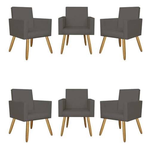 Kit 6 poltronas decorativa cadeira recepção material sintético Cor: material sintético cinza A poltrona nina traz muita segurança e conforto para seu ambiente. Sua estrutura é 100% em madeira eucalipto e todo conforto se deve a espuma com densidade d-23. Com um design sofisticado, a poltrona nina conta com acabamento em suede. Para quem indicamos nossas poltronas - para os amantes da leitura; - para trazer sofisticação para sala de estar; - para trazer aconchego em seu quarto; - para proporcionar comodidade ao seu escritório ou home office. E claro... Para presentear quem mais amamos Qual o material utilizado - tecidos suede; - espuma d-23; - percintas elásticas; - estrutura 100% madeira eucalipto; - pés madeira de eucalipto. Produto suporta até 100 kg. de fábrica de 03 meses contra defeito de fabricação. Você receberá: Seis poltrona nina pés palito. Instruções de montagem: Produto montado, sendo necessário apenas rosquear os pés. Observações importantes: -todos os produtos vão embalados com total segurança. - pode haver alguma diferença de tonalidade entre a imagem e o produto, por conta do tratamento de imagens e a calibração de cores da sua tela. Modo de limpeza: - limpar com pano limpo e moderadamente úmido Especificações técnicas Travamento da estrutura com grampos em aço galvanizados e parafusos com flange de 5 mm; Acento sustentado por percintas elásticas; Madeira de reflorestamento eucalipto; Tecido suede 100% poliéster. Dimensões Altura: 87 cm Largura: 61 cm Profundidade: 60 cm Peso: 9,5 kg . .