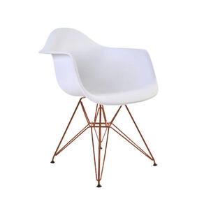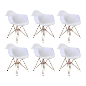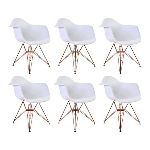 Kit 6 Poltronas Eiffel Eames Branca Com Braço Daw Em Ferro CobreA Poltrona Daw traz ousadia que combina com ambientes de estilo moderno, podendo ser usada em escritórios, cafés, salas de estar ou jantar e outros ambientes. Possuindo braços que a torna uma ótima escolha para quem está em busca de conforto e um design único.Tipo: PoltronaModelo: DawCor do Assento: BrancoCor da Base: CobreCARACTERÍSTICASAssento: PolipropilenoBase: FerroSuporta até: 120kgGarantia: 90 DiasDIMENSÕES DO PRODUTOAltura: 80cmAssento até o chão: 40cmBraço do assento até o chão: 65cmLargura: 38cmComprimento: 38cmRECOMENDAÇÕESLimpeza: Utilize um pano macio levemente úmido.Necessita montagem.ATENÇÃOAS IMAGENS SÃO MERAMENTE ILUSTRATIVAS E PODEM SOFRER VARIAÇÕES DE COR E PEQUENOS DETALHES DE ACORDO COM O SEU MONITOR, ILUMINAÇÃO DO AMBIENTE E ATÉ MESMO A SUA PERCEPÇÃO VISUAL.Kit 6 Poltronas Eiffel Eames Branca com BraÃo Daw em Ferro Cobre