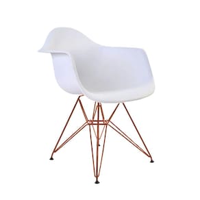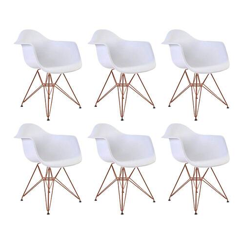 Kit 6 Poltronas Eiffel Eames Branca Com Braço Daw Em Ferro CobreA Poltrona Daw traz ousadia que combina com ambientes de estilo moderno, podendo ser usada em escritórios, cafés, salas de estar ou jantar e outros ambientes. Possuindo braços que a torna uma ótima escolha para quem está em busca de conforto e um design único.Tipo: PoltronaModelo: DawCor do Assento: BrancoCor da Base: CobreCARACTERÍSTICASAssento: PolipropilenoBase: FerroSuporta até: 120kgGarantia: 90 DiasDIMENSÕES DO PRODUTOAltura: 80cmAssento até o chão: 40cmBraço do assento até o chão: 65cmLargura: 38cmComprimento: 38cmRECOMENDAÇÕESLimpeza: Utilize um pano macio levemente úmido.Necessita montagem.ATENÇÃOAS IMAGENS SÃO MERAMENTE ILUSTRATIVAS E PODEM SOFRER VARIAÇÕES DE COR E PEQUENOS DETALHES DE ACORDO COM O SEU MONITOR, ILUMINAÇÃO DO AMBIENTE E ATÉ MESMO A SUA PERCEPÇÃO VISUAL.
