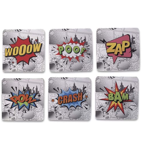 Kit 6 Porta Copos Comics Cozinha Criativa Geek Cor: Preto O Kit 6 Porta Copos Comics são uma ótima opção de presente criativo para decoração geek para sua cozinha e é ideal para quem é fã de uma boa história em quadrinhos. O kit contém 6 porta copos. Dimensões: 9 cm x 9 cm Material: Neoprene Instruções de lavagem: Pano úmido com água e sabão neutro. Marca: Geek Vip