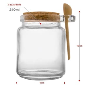 - Capacidade: 240ml. - Dimensões da colher: 8,5cm X 1,7cm - Medidas do pote: 9,5cm X 6,5cm Altura X Largura - Cor: Transparente - Material: Vidro borossilicato - Kit 6 Potes Ean: 7899766709608