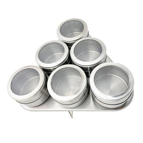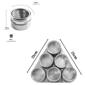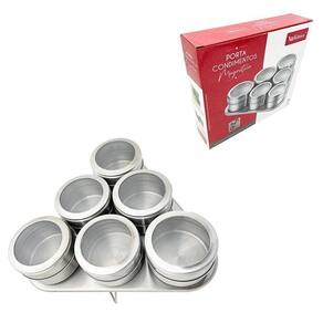 Principais Características:- Material: Aço inoxidável de alta durabilidade- Capacidade de cada pote: 75 ml- Dimensões de cada pote: 6,5 cm (diâmetro) x 4,5 cm (altura)- Tampa transparente com visor para fácil identificação- Furação dosadora prática para temperar diretamente- Fixação magnética em superfícies metálicas- Bandeja metálica inclusa para organização- Design moderno e funcional