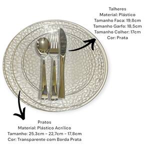 Kit 6 Pratos Acrílico Borda Prata 25Cm + 18 Talheres Natal