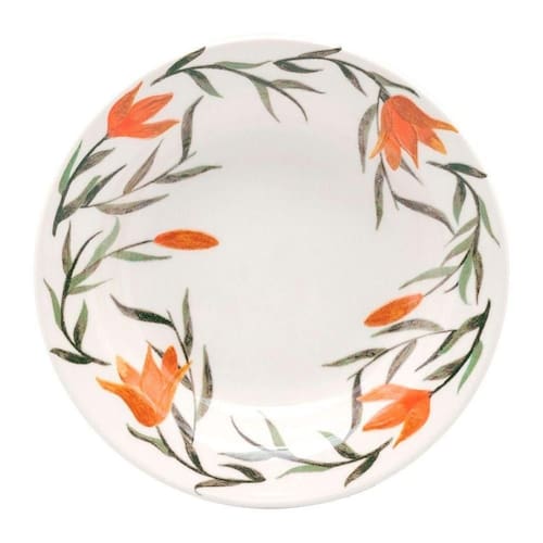 cada borda e pires recebem o desenho feito à mão da flor de cor laranja junto de