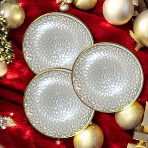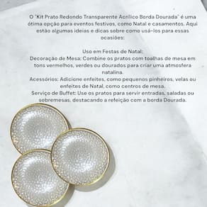 Design Elegante: A borda Dourada combina beleza e requinte, tornando cada refeição uma experiência especial. Material Durável: Feitos em acrílico de alta qualidade, os pratos são resistentes, leves e perfeitos para uso interno e externo. Versatilidade: Ideal para servir saladas, entradas, pratos principais ou sobremesas em festas, celebrações e reuniões familiares. Fácil de Limpar: Podem ser lavados à mão, facilitando a limpeza após o uso.