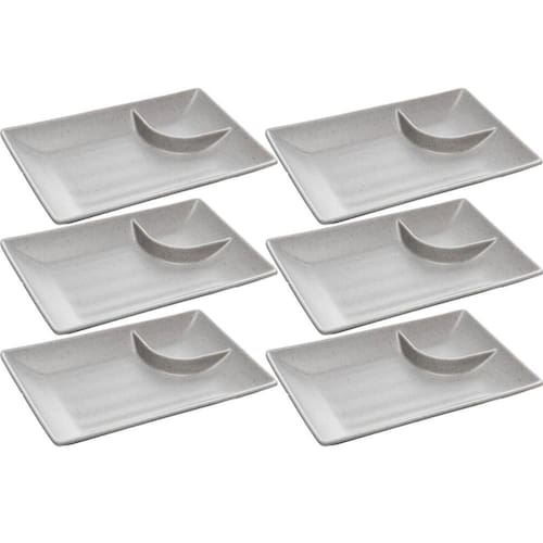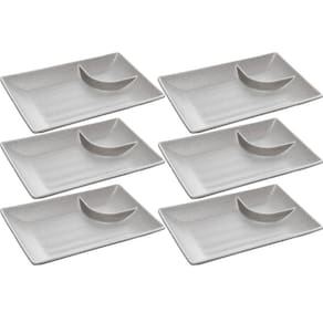 Garantia: 90 dias / Peso: 0,756kg / Cor predominante: cinza / Referência: 7798140155256 Conteúdo: 6 pratos retangulares de Melamina com molheira Lyor; Dimensões de cada prato: 19cm (C) x 12,5cm (L) x 3cm (A); Dimensões da área de uso: 16,5cm (C) x 11cm (L) x 2cm (A); Dimensões da molheira: 6,5cm (C) x 5,5cm (L) x 1cm (A); Material: melamina; Modelo: Granilite.