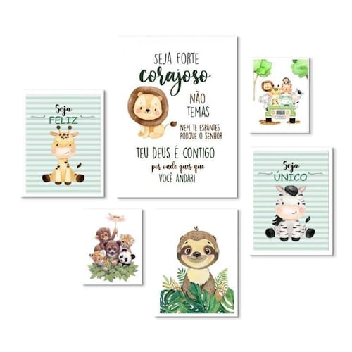 Kit 6 quadros quarto infantil safari - cristão Moldura: madeira branca Informações do produto tire todas as suas dúvidas no descritivo abaixo: decoração para quarto, sala, cozinha, escritório, área gourmet e muito mais. Chega de paredes vazias medidas - kit composto por 6 quadros, sendo 2 quadros com medida 18x24cm, 3 quadros com 24x33cm e 1 quadro com medida 33x45cm. Material do papel - papel fotográfico brilhante de altíssima resolução acabamento - todos os quadros são acompanhados de uma película de acetato para proteção da imagem. - os quadros são embalados de forma segura com plástico bolha com camada dupla de acordo com o tamanho dos quadros. - de 3 meses. Meu quadro chegou. Como posso fixá-lo Você precisa apenas de um martelo e um prego, pois os quadros já vão acompanhados de penduradores. Esta é a forma mais indicada. Caso prefira, você pode utilizar uma fita dupla face neste caso, sugerimos de alta qualidade para evitar que descole e seu quadro caia . Como posso limpar meu quadro A limpeza é feita como um móvel comum da sua casa. Apenas um pano seco ou espanador são suficientes para tal Marca: Não Informado