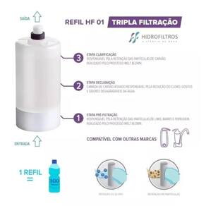 Este refil responsável por reter partículas presentes na água, eliminar o excesso de cloro, gostos e odores desagradáveis da água e evitar a proliferação de bactérias.
