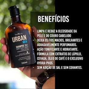 O Shampoo 3x1 Urban Men limpa seu cabelo, barba e bigode com praticidade. Sua fórmula traz os ingredientes das melhores cervejas IPA's do mundo para oferecer um cuidado rápido, eficaz e com perfume extremamente agradável. Fórmula livre de sal e corantes.