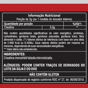 Strong creatine 100g fisionutri Composição:Creatina monohidradata micronizada.Alérgicos: podem conter traços de derivados do leite da soja e do ovo. Não contém glúten.Apresentação:Pote de 100g Sugestão de uso:Diluir 1 medida, o equivalente a 3g em 200ml de água. Não exceder a recomendação diária. Conservação:Após aberto, manter a embalagem bem fechada e armazenar em local fresco e ao abrigo de luz.Produto lacrado para sua proteção. Não utilizar em caso de violação. Manter fora do alcance de crianças. produto dispensado de registro conforme rdc 27/2010.