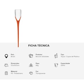País: Brasil Produtor: Boccati Utilidades Tipo: Taças / Copos de Plástico Dimensões: 5,5 x 35,5cm Peso: 68g Capacidade: 210ml Material Taça: PS (Poliestireno) Material Haste: PP (Polipropileno) Cor Taça: Transparente Cor Haste: Laranja