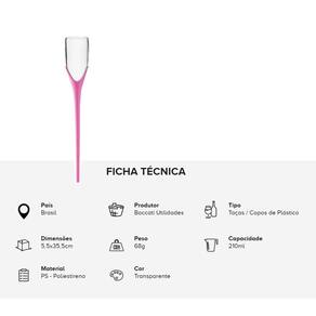 País: Brasil Produtor: Boccati Utilidades Tipo: Taças / Copos de Plástico Dimensões: 5,5 x 35,5cm Peso: 68g Capacidade: 210ml Material Taça: PS (Poliestireno) Material Haste: PP (Polipropileno) Cor Taça: Transparente Cor Haste: Rosa Pink