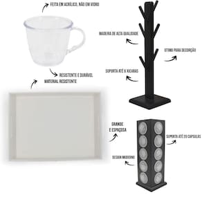 Kit 6 xicara porta capsulas para dolce gusto bandeja acrílico cores Cor xícaras: cristal Composição do kit; 6 xícaras 1 bandeja 1 suporte de xícaras 1 porta capsulas para nespresso Xícara 85ml acrílica