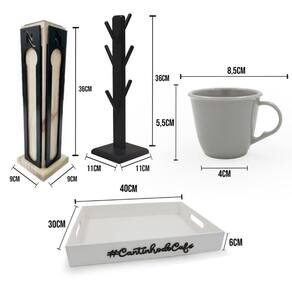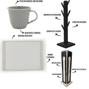 Kit 6 xicara porta capsulas para nespresso bandeja cores acrílico Cor xícaras: cinza Composição do kit;6 xícaras1 bandeja1 suporte de xícaras1 porta capsulas Xícara 85ml acrílica As xícaras são muito bonitas e esse acrílico traz um charme a mais ao produto, deixando-o mais decorativo para a hora do café. Você pode usar em casa ou no escritório, ter sempre à mão sua xícara para tomar aquele cafezinho, capuccino e até um chocolate quente se estiver com vontade. Capacidade 85mlMaterial - acrílicoAltura - 5,5 cmLargura - 8,5 cm Bandeja cantinho do café versátil e multiuso Feita em mdf de 6mm com pintura em tinta acrílica na cor preta ela é ideal para organizar o seu lar, servir um cafezinho para os amigos, organizar papeis de escritório entre diversas outras utilidades. Bandeja versátil de qualidade, combinando com todos os ambientes no qual estiver Suas medias são40x30x6 externa 38,5 x 28,5 x 5,5 na parte interna Possui as laterais vazadas como uma alça. Suporte porta xícara caneca em 6 pinos xicaras Esse é o produto ideal para decorar o seu tão especial cantinho do café ou até mesmo presentear uma pessoa querida, além da beleza o porta xicaras é feito em mdf que é muito resistente, ideal para xicaras/canecas de até 240ml. Com esse porta xicaras você vai conseguir deixar seus armários muito mais organizados. Medidas suporte:Altura: 36 cmBase: 11x11Peso: 282gMaterial de composição: madeira pinus Porta cápsula Esse porta cápsulas tem ar moderno feito em madeira mdf pintada de preto, dando um ar de elegância para qualquer canto de sua casa. Organize seu cantinho do café com as cápsulas sempre a mão e ainda decore o seu ambiente com certeza vai ser uma peça que vai chamar a atenção e tirar elogios Feito em mdf com pintura preta tinta acrílica Comporta 20 capsulasMedidas 32x11x11 Cápsulas não inclusas - entregam para todo país Quem somos Marca: Dupétriz