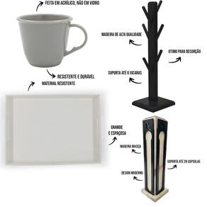As xícaras são muito bonitas e esse acrílico traz um charme a mais ao produto, deixando-o mais decorativo para a hora do café. Você pode usar em casa ou no escritório, ter sempre à mão sua xícara para tomar aquele cafezinho, capuccino e até um chocolate quente se estiver com vontade.