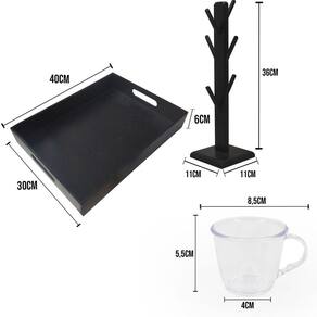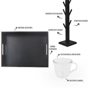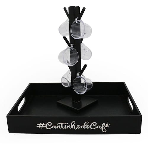 Kit 6 xicaras suporte acrílico cristal bandeja cantinho café Composição do kit;6 xícaras1 bandeja1 suporte de xícaras Xícara 85ml acrílica transparente As xícaras são muito bonitas e esse acrílico cristal traz um charme a mais ao produto, deixando-o mais decorativo para a hora do café. Você pode usar em casa ou no escritório, ter sempre à mão sua xícara para tomar aquele cafezinho, capuccino e até um chocolate quente se estiver com vontade. Capacidade 85mlMaterial - acrílicoAltura - 5,5 cmLargura - 8,5 cm Bandeja cantinho do café versátil e multiuso Feita em mdf de 6mm com pintura em tinta acrílica na cor preta ela é ideal para organizar o seu lar, servir um cafezinho para os amigos, organizar papeis de escritório entre diversas outras utilidades. Bandeja versátil de qualidade, combinando com todos os ambientes no qual estiver Suas medias são40x30x6 externa 38,5 x 28,5 x 5,5 na parte interna Possui as laterais vazadas como uma alça. Suporte porta xícara caneca em mdf 6 pinos xicaras Esse é o produto ideal para decorar o seu tão especial cantinho do café ou até mesmo presentear uma pessoa querida, além da beleza o porta xicaras é feito em mdf que é muito resistente, ideal para xicaras/canecas de até 240ml. Com esse porta xicaras você vai conseguir deixar seus armários muito mais organizados. Medidas suporte:Altura: 24 cmBase: 11x11Peso: 282gMaterial de composição: pinus Perguntas frequentes: - entregam para todo país Quem somos Marca: Dupétriz