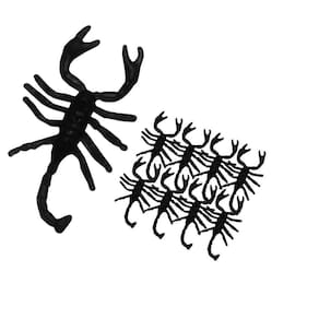 Kit com 50 pacotes de enfeites, sendo 12 escorpiões pretos de borracha em cada unidade.