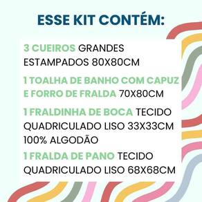 Especificações do Kit: Contém 3 Cueiros Grandes Estampados 80x80cm Contém 1 Toalha de Banho com capuz e forro de fralda 70x80cm Contém 1 Fralda de pano tecido quadriculado liso 68x68cm 100% algodão Contém 1 Fraldinha de boca tecido quadriculado liso 33x33cm 100% algodão