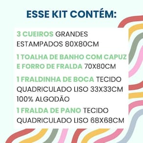 Especificações do Kit: Contém 3 Cueiros Grandes Estampados 80x80cm Contém 1 Toalha de Banho com capuz e forro de fralda 70x80cm Contém 1 Fralda de pano tecido quadriculado liso 68x68cm 100% algodão Contém 1 Fraldinha de boca tecido quadriculado liso 33x33cm 100% algodão