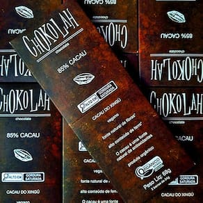O chocolate 85% cacau com açúcar demerara orgânico chokolah é feito com cacau trinitário fino e raro do xingu, oferecendo uma experiência sensorial única com notas terrosas e frutadas.