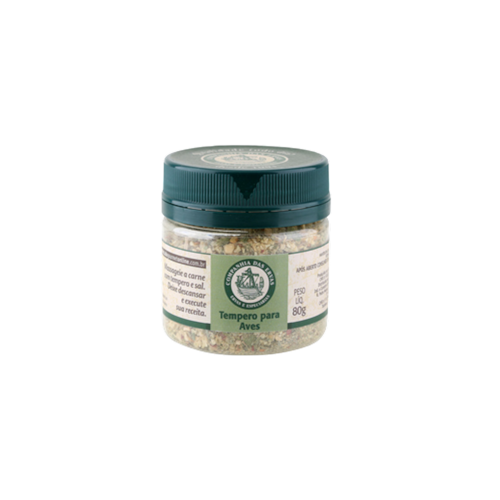 O Tempero para Aves Companhia das Ervas é uma mistura de Alho, cebola, salsa, cebolinha, manjericão desidratado e pimenta calabresa, sem sal para temperar aves em geral.