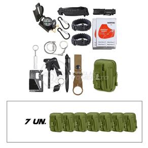 - Materiais: Tecido/Pano (Bolsa), Aço (Faca, cartão multifuncional, caneta e etc.), Plástico (Lanterna), Alumínio (Manta Térmica).
