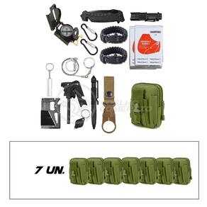 - Materiais: Tecido/Pano (Bolsa), Aço (Faca, multifuncional, caneta e etc.), Plástico (Lanterna), Alumínio (Manta Térmica).