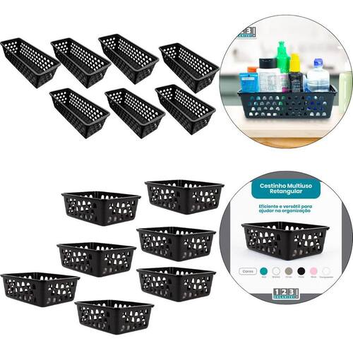 Kit 7 Cesto Multiuso Comprido Retangular e 7 Cesto médio Cesto Multiuso Comprido Retangular Preto 123 Organizei Os Cestos Multiuso 123Organizei, são muito charmosos e discretos. Podem ser em armários, gavetas, guarda roupas e até mesmo em banheiro. MEDIDAS: Altura: 8,00cm Largura: 11,00cm Comprimento: 28,00cm 123organizei ------------------------------------------------------------ CESTO PRETO Médio 123ORGANIZEI Cor PRETO Medidas 20x15,5x6,5Cm Material PLástico Marca 123Organizei Marca: Não Informado Ean: 7909506783253