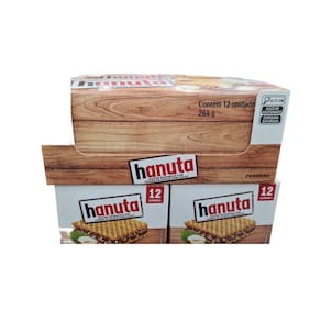 Doce momento: o chocolate wafer hanuta promete cativar os corações de todo nutella lover. O sabor intenso do creme de avelãs com cacau inigualável da ferrero, fica ainda mais gostoso acompanhado da casquinha de waffle, em um mix de crocância e cremosidade. Um doce presente que surpreende ótima fonte de sabor e energia na hora do break a caixa fechada com 12 unidades rende mais na sua despensa. A embalagem vem na quantidade ideal de chocolate todo dia. Ótimo para levar na bolsa, na lancheira e na mochila Conteúdo da embalagem: 12 unidades de biscoito waffle com 22g cada, embaladas individualmente. Ingredientes - hanuta ferrero: açúcar, gorduras vegetais, farinha de trigo, soro de leite em pó, avelãs 10,5% , cacau parcialmente desengordurado 7% , leite desnatado em pó, sal, massa de cacau, proteínas do soro do leite, de cacau, emulsificante lecitinas , fermento químico bicarbonato de sódio , aromatizante. Alérgicos: contém avelãs, leite e derivados; derivados de: trigo e soja. Contém glúten. Contém lactose.