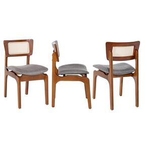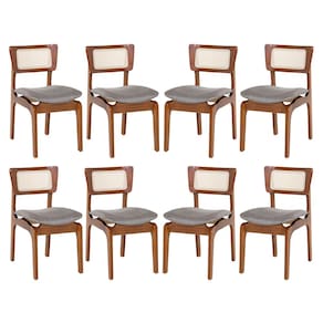 CARACTERÍSTICAS TÉCNICAS: - Produzido em Madeira Maciça Sustentável - Acabamento em Verniz na cor Imbuia - Encosto com Revestimento em Rattan com Fibra Sintética Quadriculada na cor Bege - Assento Estofado Preenchido com Espuma D23 - Assento com Revestimento em Linho Cinza L55 - Cadeira Entregue Montada *Kit Composto por Oito Cadeiras Portugal
