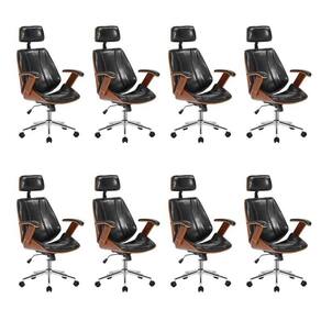 A cadeira Kopenhagen Presidente é toda revestida em couro ecológico e possui sua estrutura em madeira, o que a torna ótima por conta de seu design para salas de reuniões e presidência. Ela também possui o mecanismo relax, o que irá manter quem estiver sentado nela mais confortável, o que unido a seu encosto de cabeça é ainda mais confortável, além de ser possível ajustar a altura do assento! Altura do Conjunto: 124 cm Ambiente: null Ambiente Principal: Escritório Cor: Preto Informação Complementar: 8x Cadeira Escritório Presidente Giratória Kopenhagen com Apoia Cabeça Preto/Amadeirado Largura: 61 cm Altura: 124 cm Peso: 16,5 kg Profundidade: 63 cm Necessita Montagem: Sim